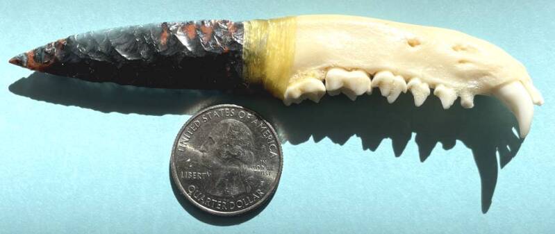 An interesting miniature of a ceremonial knife made of flint and an animal Jaw bone. )