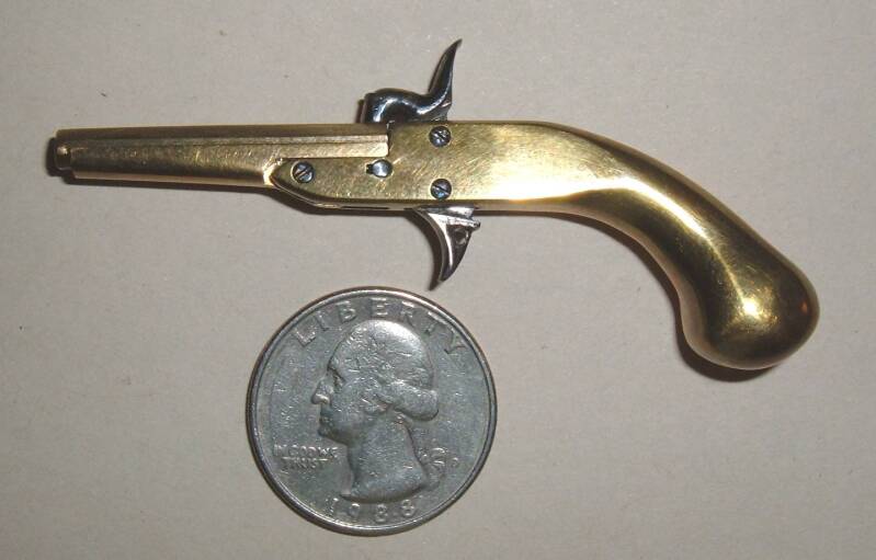 A 2mm pinfire tip down barrel. Highland style pistol Made of brass and steel. I designed and made this one furnishing drawings for customers to make one for themselves. The drawings are in the Minitaure Arms Society's (Plans Library)