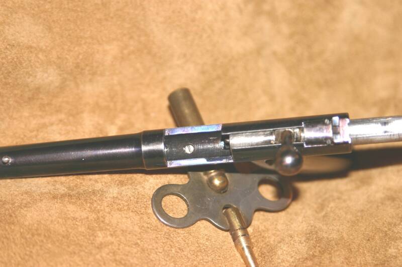 This view of open breach showing bolt with firing pin striker in the cocked position. also showing the locking lever in the unlocked position.