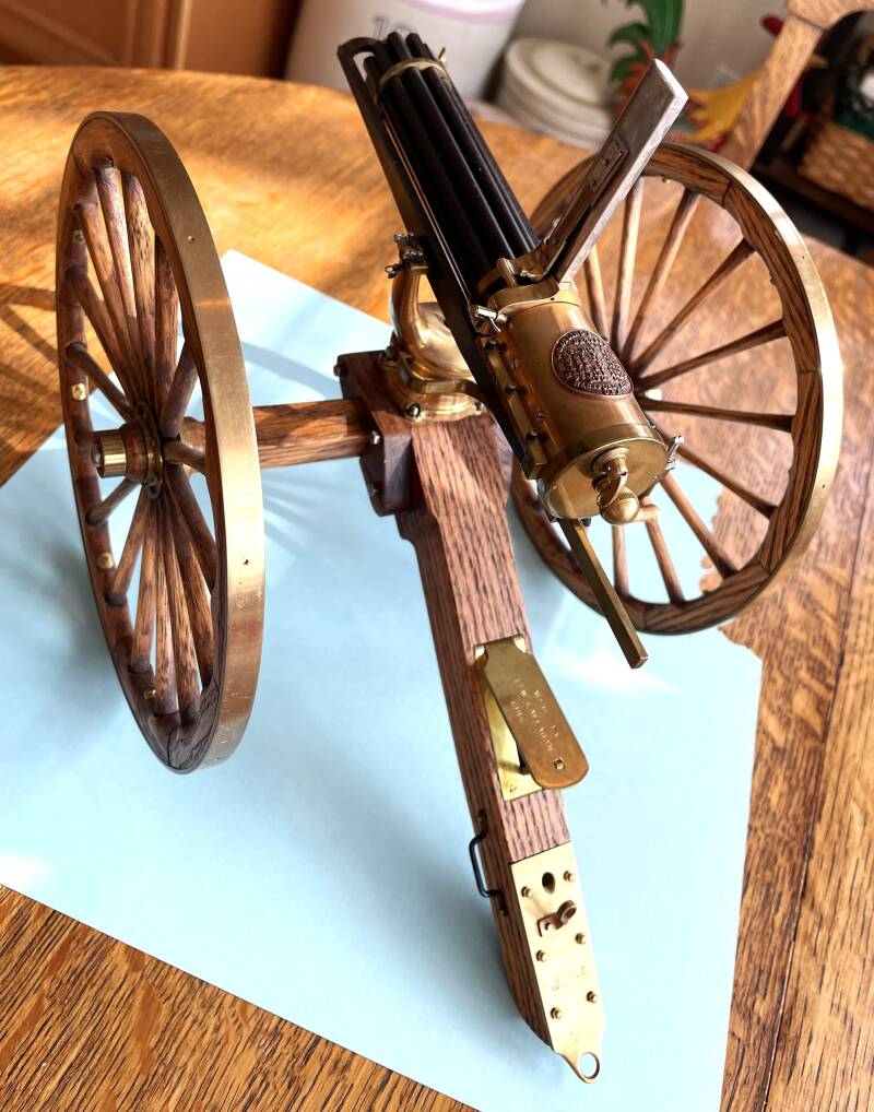 This is a 1/8 scale Gattling gun . on a oak and brass field carriage. I made this from 1/2 scale drawings I purchased from RG&G. I then rendered the drawings into Autocad and reduced it to a displayable size. It all functions but does not shoot. The original drawings were for a 1/2 scale 22 caliber actual shooting gattling. .Stands about 10" high, with 7" Dia. wheels. (at this scale too small to shoot)